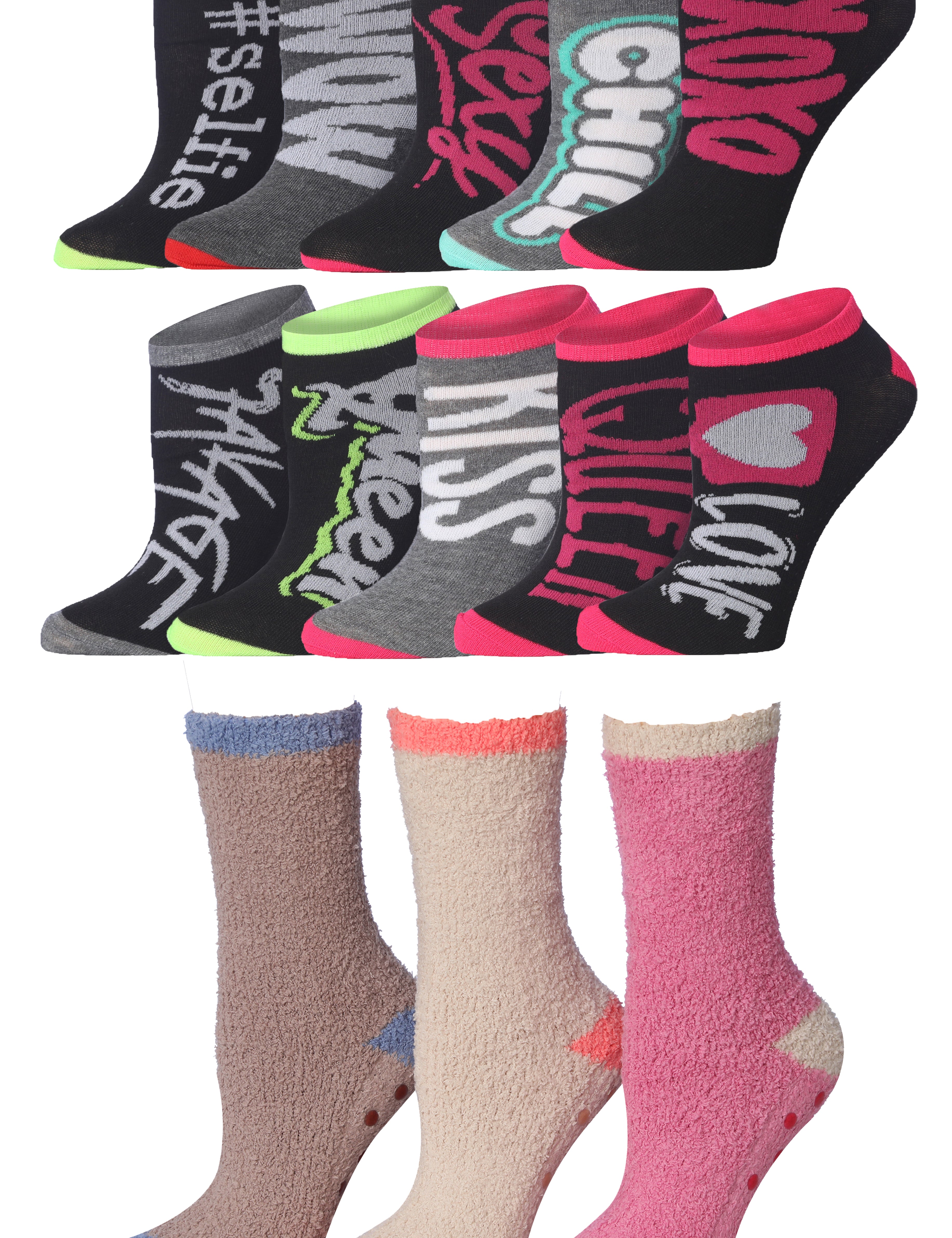 Anti-Skid Mocha Blush Fuzzy Socks - 3 Pairs + Love Notes Ankle Socks - 10 Pairs Bundle