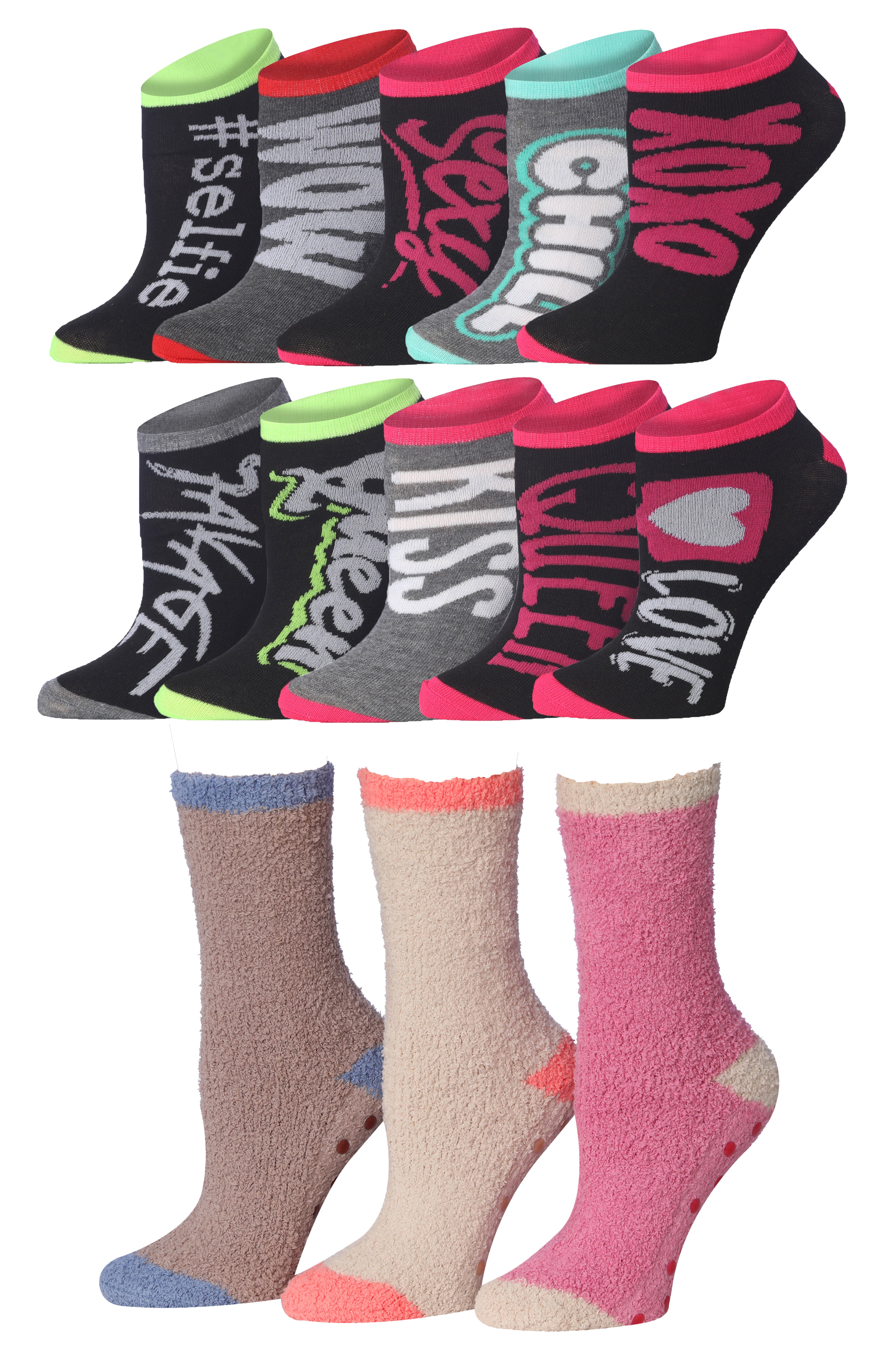 Anti-Skid Mocha Blush Fuzzy Socks - 3 Pairs + Love Notes Ankle Socks - 10 Pairs Bundle