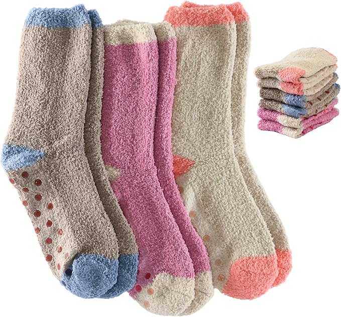 Soft, plush fuzzy socks with non-slip grips for added safety on smooth floors—ideal for cozy indoor wear. -